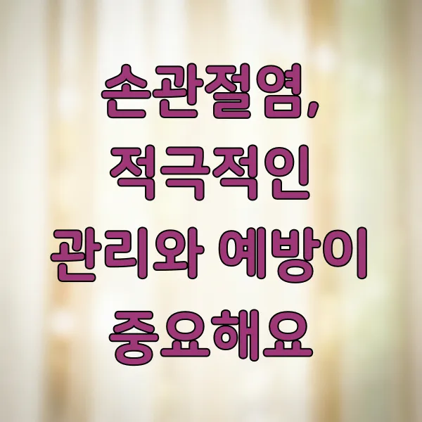 A4: 건강한 식습관 을 유지하고, 손을 무리하게 사용하는 것을 피하는 것이 좋아요. 또한, 규칙적인 운동으로 손 관절 주변 근육을 튼튼하게 유지하는 것도 예방에 도움이 될 수 있답니다. 금연 또한 관절 건강에 긍정적인 영향을 미쳐요.