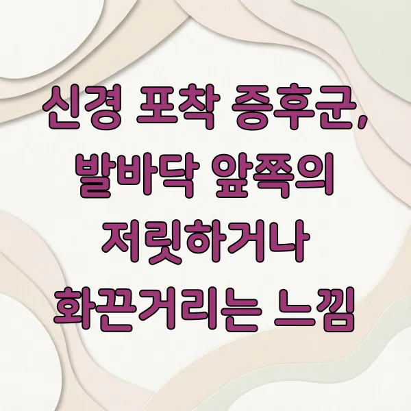 이런 신경 포착 증후군은 마치 전기 충격이 오는 것처럼 찌릿하거나, 화끈거리는 듯한 느낌 으로 나타나는 경우가 많아요. 때로는 발가락이나 발바닥 앞쪽에 감각이 둔해지거나 저릿한 느낌을 동반하기도 합니다.